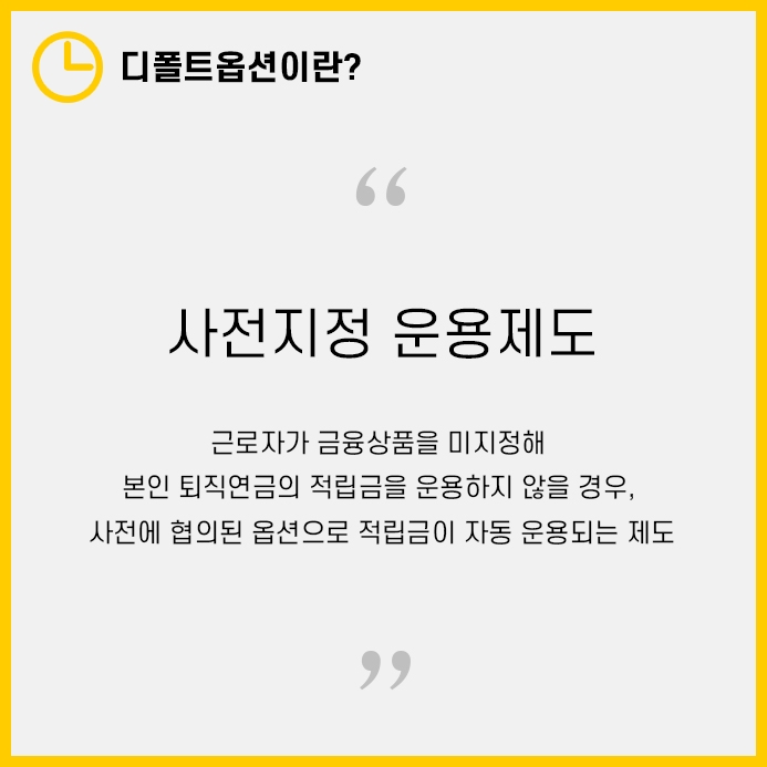 디폴트옵션은 사전지정 운용제도와 같은 뜻으로, 근로자가 본인 퇴직연금 적립금을 운용하지 않으면 사전 협의된 금융상품으로 적립금이 운용되는 제도입니다.