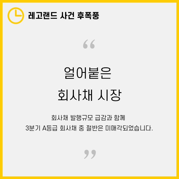 최근 금리인상으로 가뜩이나 위축된 회사채 시장이 레고랜드 사태로 인해 더욱 얼어붙었습니다.