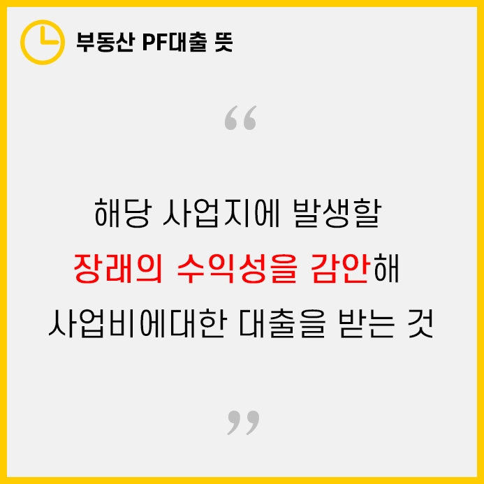 부동산 PF 대출 뜻은 '프로젝트 파이낸싱'의 약자로 건물, 사업지에 생길 미래의 수익성을 고려해 대출을 받는 것을 의미합니다.