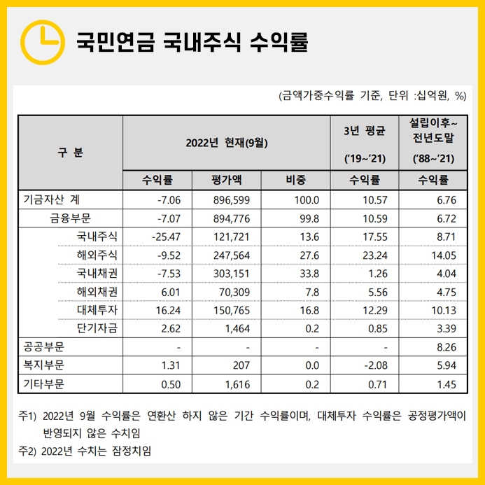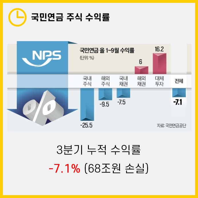 하지만 안전투자의 대명사인 국민연금 역시 하락장을 버티기란 쉽지 않았습니다. 국민연금 올해 3분기 누적 수익률(2022년 1월~9월)은 -7.1%로 68조원이나 손실이 발생했습니다.