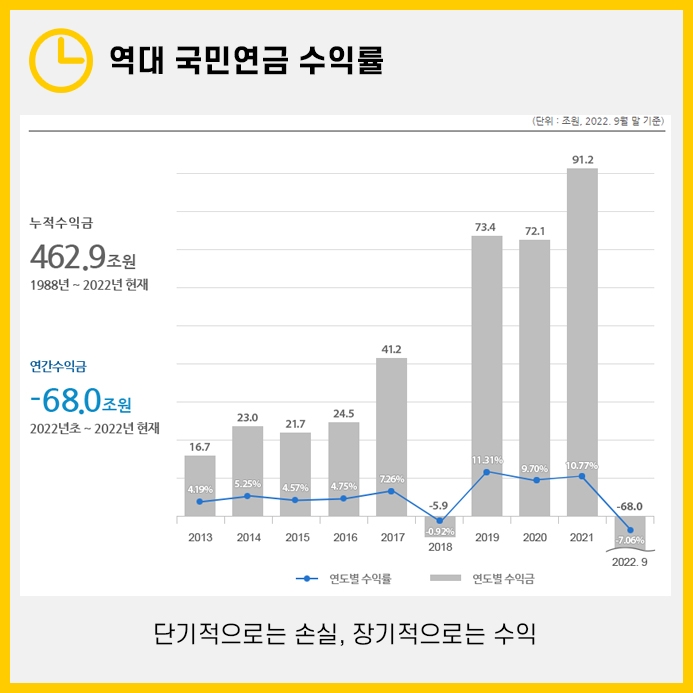 올해에는 국민연금이 손실을 입었지만, 1988년부터 2022년 현재까지 462.9조원의 누적 수익금이 발생해 장기적으로는 오히려 수익을 더 많이 보았습니다.