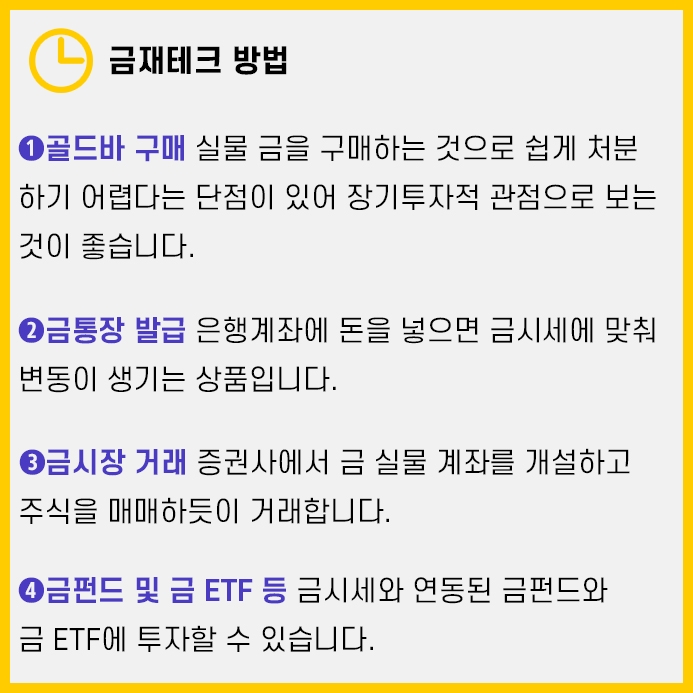 금재테크는 금을 매매하는 방식으로 수익을 내는 투자법을 뜻합니다.