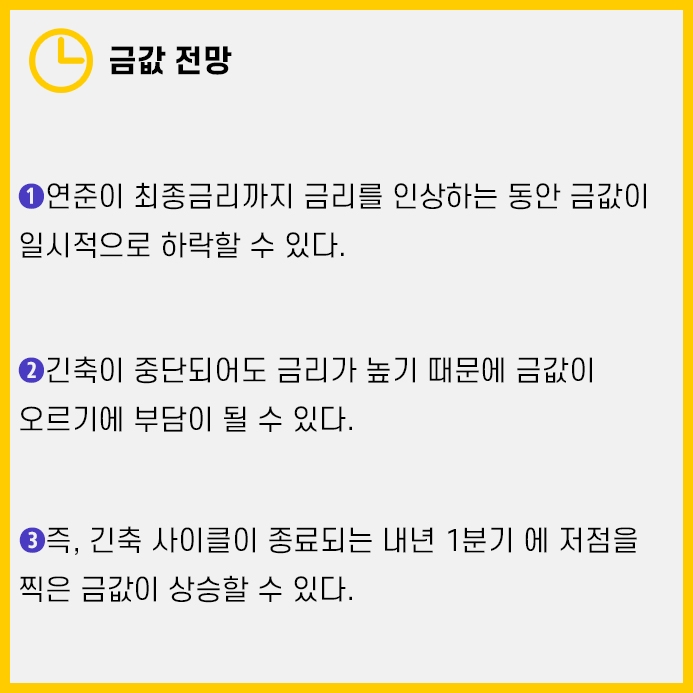 - 최종금리가 올라가면서 금값이 일시적으로 하락할 수 있다.