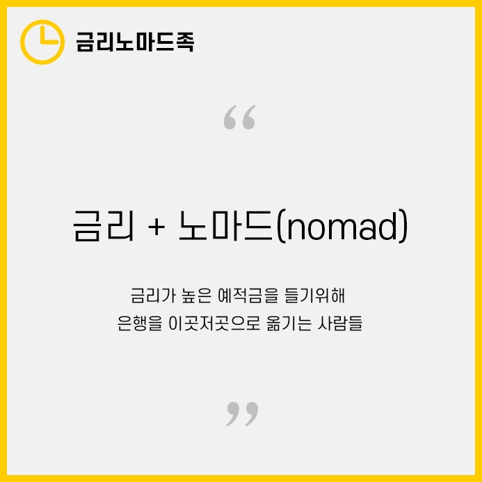 금리 노마드족은 금리와 노마드(Nomad 유목민)의 단어를 합친것으로, 금리가 높은 예적금을 찾아 은행을 갈아타는 사람들을 뜻합니다.