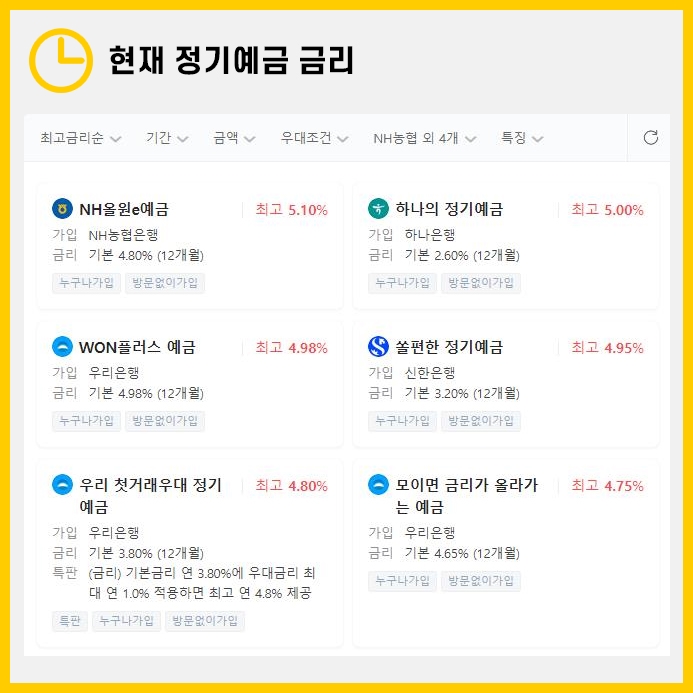 그 뒤로는 하나은행 하나의 정기예금(5%), 우리은행 WON플러스 예금(4.98%), 신한은행 쏠편한 정기예금(4.95%)가 있습니다.