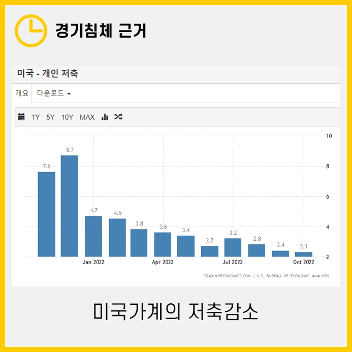 2022년 10월의 미국 가처분 소득대비 저축률은 2.3%로 약 17년만에 최저치를 기록했습니다.