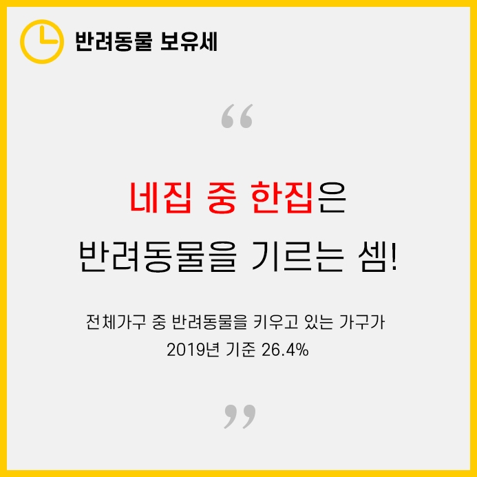 2019년 기준 대한민국에 반려동물을 키우는 가정은 전체에서 26.4%로 4집당 1집은 반려동물을 키우고 있었습니다.