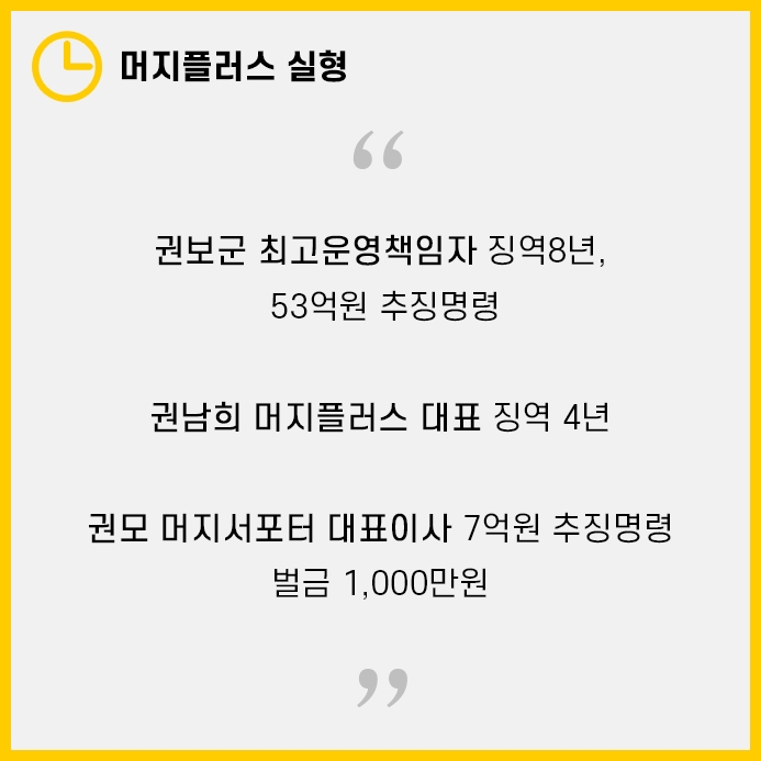 머지플러스 최고운영책임자인 권보군은 징역8년, 머지플러스 대표 권남희는 징역4년, 머지서포터 권모 대표이사는 징역 2년6개월과 집행유예 4년이 선고되었습니다.