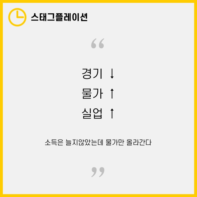 즉, 스태그 플레이션은 외부적 요인으로 물가가 올라 소득이 오히려 줄어든 데에서 차이가 있습니다.