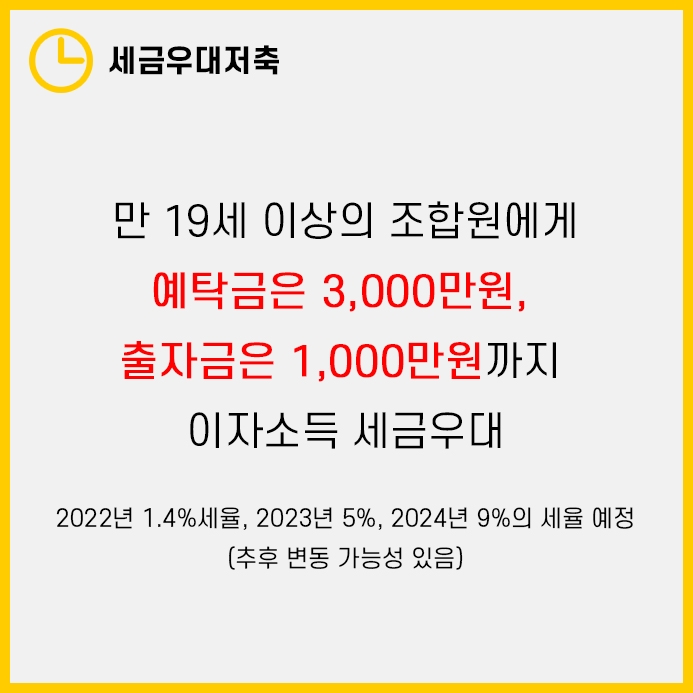 만 19세 이상의 조합원의 예탁금은 3,000만원, 출자금은 1,000만원까지 세금우대를 해줍니다.