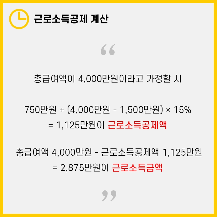 이때 식은 750만원 + (4,000만원 - 1,500만원) × 15%로 1,125만원이 근로소득공제액입니다.