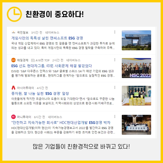 국내기업도 ESG경영을 강조하며 경영방침 중 '친환경' 항목을 중요하게 여기는 기업들이 늘어나는 추세입니다.