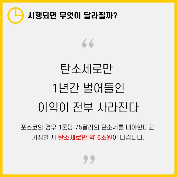 만일 포스코에서 1톤당 75달러의 탄소세가 부과된다면 탄소세만 약 6조원이 나갑니다.