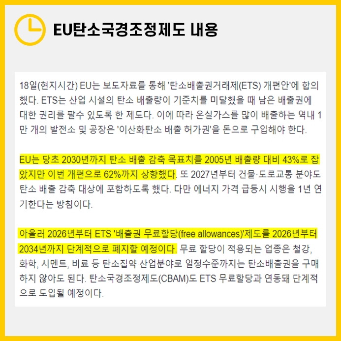 EU에서는 과거부터 장기간 탄소감축에 대한 논의가 되어왔지만 한국에서는 이러한 준비과정이 없었기에 더욱 큰 타격을 받을 것으로 전망되고 있습니다.