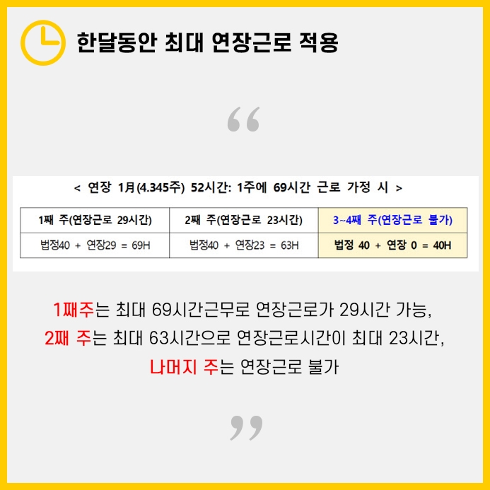 둘째주는 월기준 최대 52시간 연장근무 - 29시간 = 23시간의 연장근로가 가능합니다. 따라서 최대 63시간 근무가 됩니다.