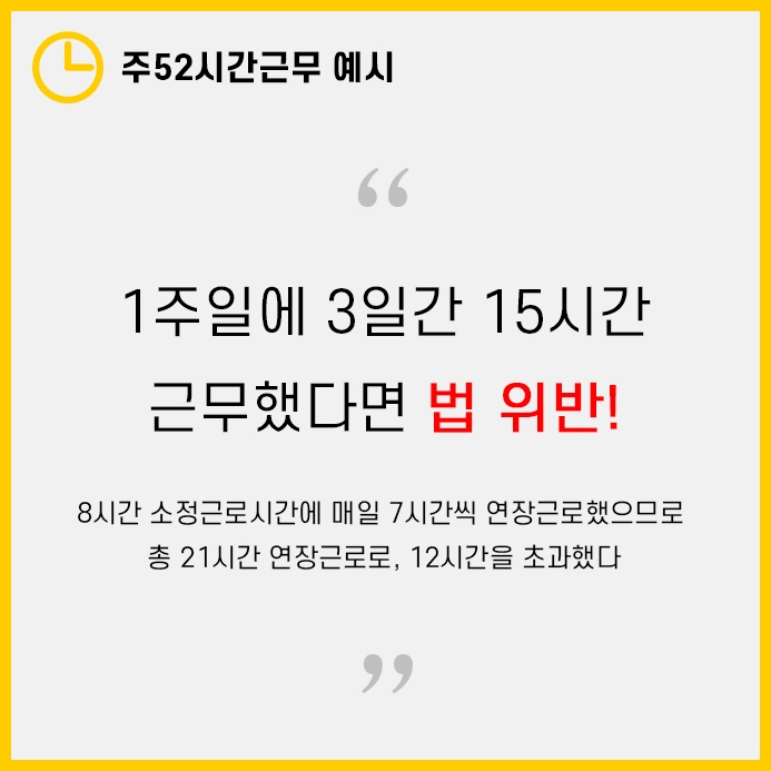 1주일에 52시간을 초과하지 않아서 합법처럼 보이지만 실제로는 이럴 경우 근로기준법 위반에 해당됩니다.