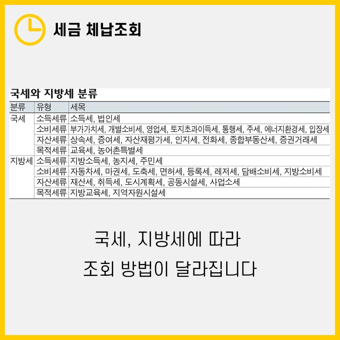 국세, 지방세의 세금의 분류에 따라 세금 체납조회 방법이 달라지므로 먼저 본인이 조회할 세금이 어느쪽이 해당되는지 확인 후 조회하셔야 합니다.