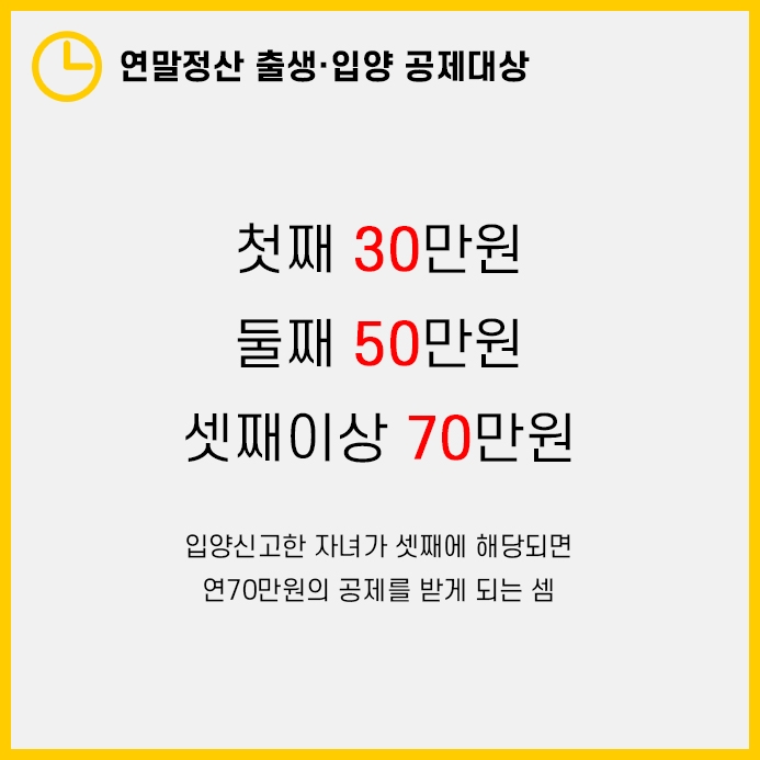 연말정산 출생·입양 자녀가 있을 경우 첫째는 30만원, 둘째는 50만원, 셋째 이상은 연70만원이 됩니다.