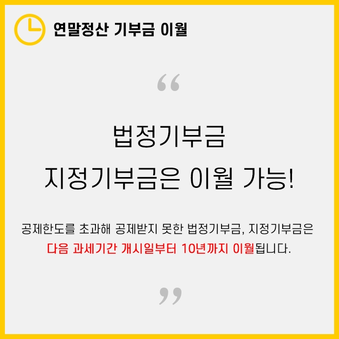 연말정산 기부금 이월제도는 법정기부금, 지정기부금에 한해 다음 과세기간 개시일로부터 10년까지 이월됩니다.