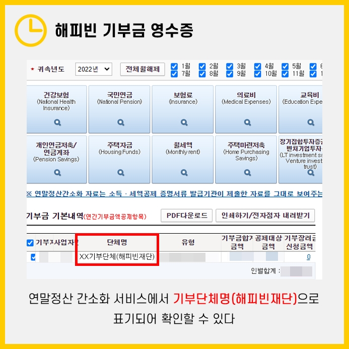 기부 내역은 연말정산의 '기부금' 항목에서 기부한 단체명과 함께 (해피빈재단)으로 표기되어 나타납니다.