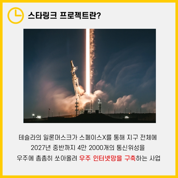 스타링크 프로젝트는 테슬라, 스페이스X의 CEO인 일론머스크가 2027년 까지 4만 2000개의 위성을 우주에 쏘아올려 우주 인터넷망을 구축하려는 프로젝트입니다.