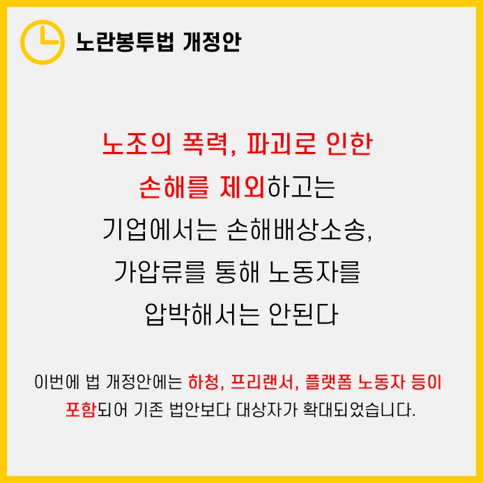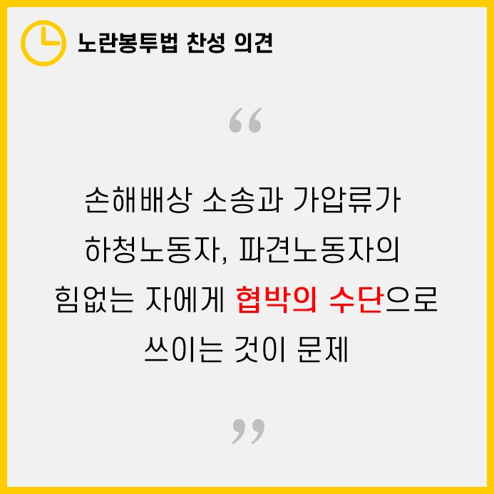 기업의 손해배상 소송은 큰 노조가 아닌 하청노동자와 같은 힘이 없는 약자에게 협박의 수단으로 많이 쓰이고 있기 때문에 이번 개정안에 대해 긍정적으로 해석했습니다.