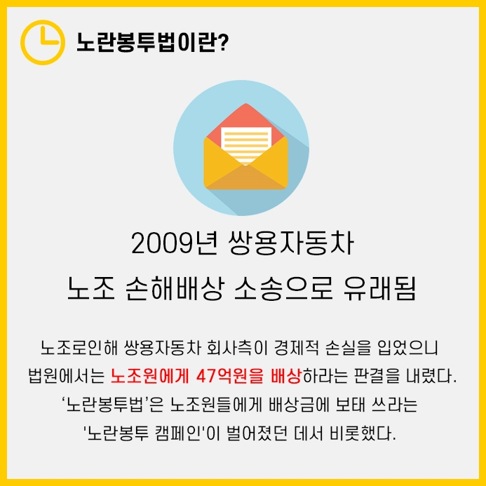 이를 안타깝게 여긴 한 시민은 노란봉투 안에 47,000원씩 10만명이 모아 노조원을 돕자는 아이디어를 내게됩니다.