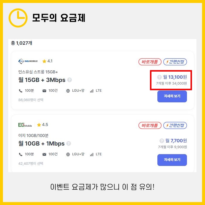 이벤트 요금제는 초기 몇달간은 저렴한 가격으로 요금제를 이용할 수 있지만, 이벤트 기간이 지나면 가격이 오르므로 이 점을 유의하셔야 합니다.