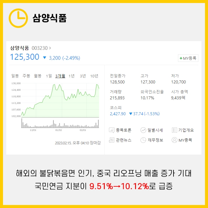 또한 중국의 리오프닝 역시 호재로 작용하여 국민연금은 삼양식품의 전망을 좋게 해석했습니다.