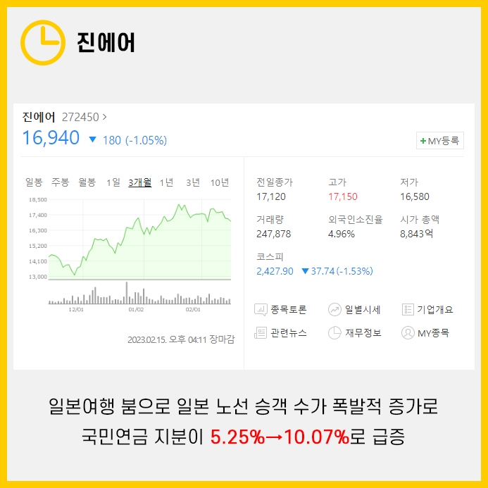 일본여행 인기와 함께 중국 리오프닝까지 호재가 겹쳐 주가가 더 상승할 여력이 있을 것이라고 판단한 것입니다.