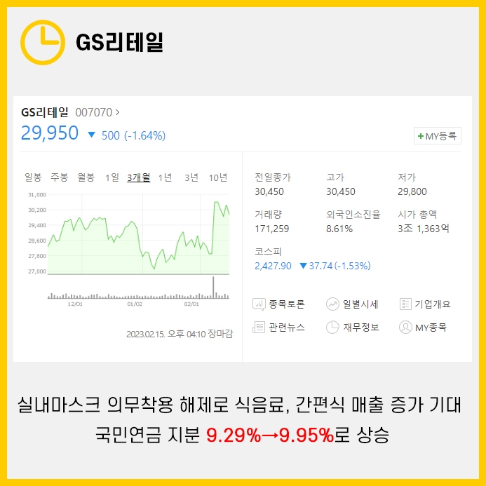실내 마스크 해제로 인해 시민들의 식음료, 간편식 매출이 증가할 것으로 예측되자 국민연금은 GS리테일의 지분을 9.29%→9.95%로 늘려왔습니다.