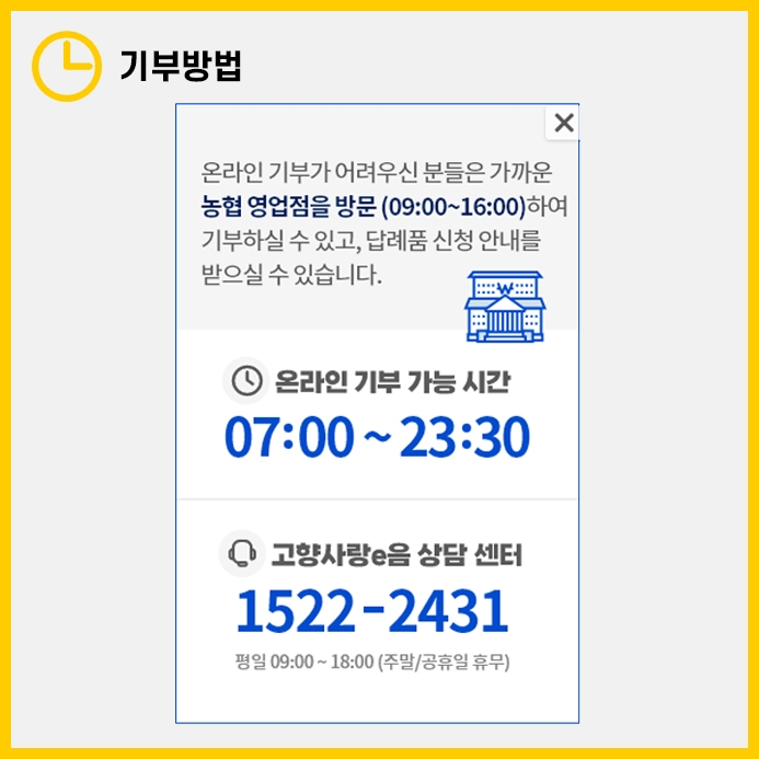 온라인기부가 어려운 경우엔 농협영업점(이용시간 09:00~16:00)에서 기부를 하는 것도 가능합니다.