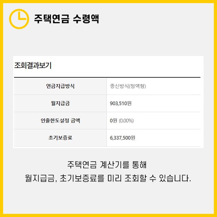 이렇게 주택연금 계산기를 통해 주택연금 수령액을 미리 조회해 볼 수 있었습니다.