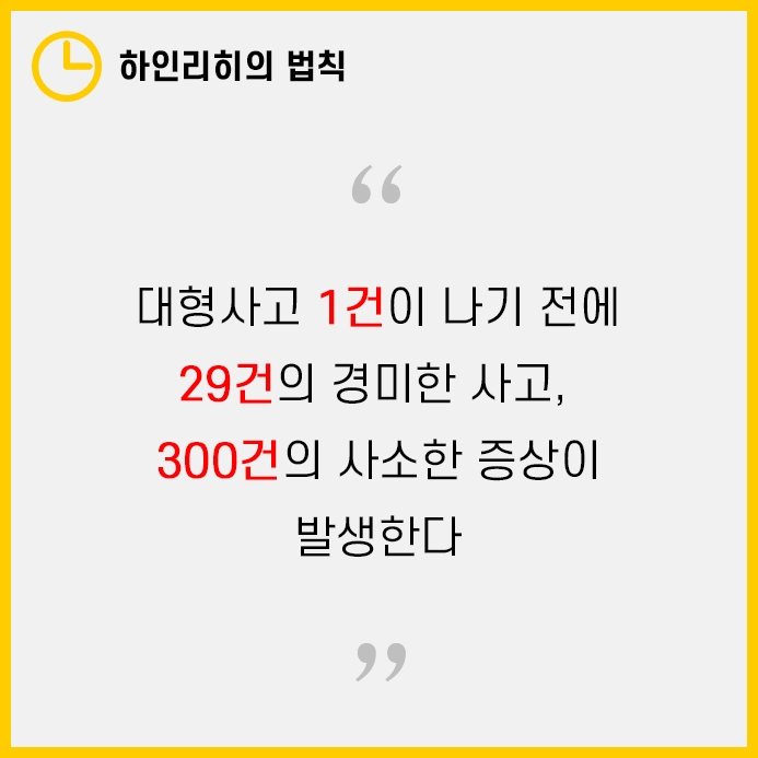 하인리히의 법칙은 대형사고 1건이 일어나기 전 29건의 경미한 사고, 경미한 사고 전에는 사소한 증상 300건이 일어난다는 뜻입니다.