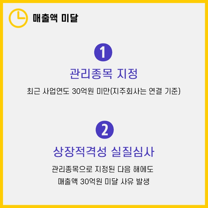 둘째, 매출액이 30억원 미만이라면 당해에 관리종목 지정이 됩니다. 만일 다음해에도 매출액 30억원 미만이라면 상장적격성 실질심사 대상이 됩니다.