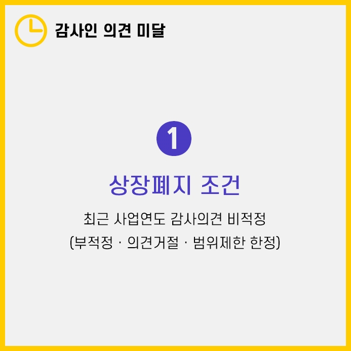 최근 사업연도 감사의견이 의견거절, 부적정, 범위제한 한정 중 하나일 경우 상장폐지 조건입니다.