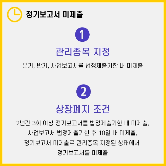 상장폐지 조건은 2년간 3회이상 기한내에 정기보고서를 제출하지 않은 경우, 사업보고서를 법정 제출 기한이 지나고 10일 내로 제출하지 않은 경우 해당됩니다.