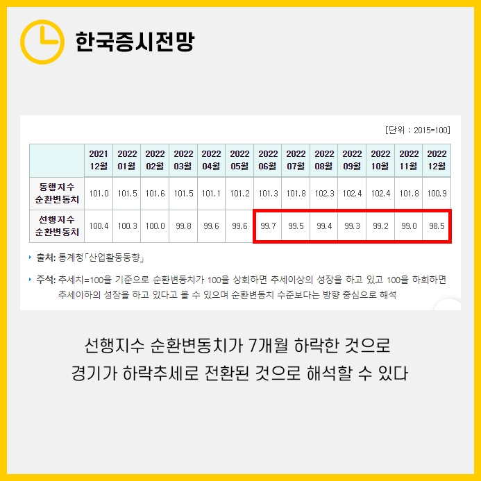2022년 6월부터 7개월간 국내의 선행지수 순환변동치가 하락해 한국증시전망은 하락추세로 전환되었다고 볼 수 있습니다.