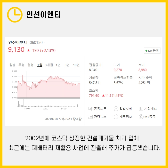 최근엔 폐배터리 리사이클링 사업까지 확장하게 되며 인선이엔티 주가가 크게 뛰기도 했습니다.