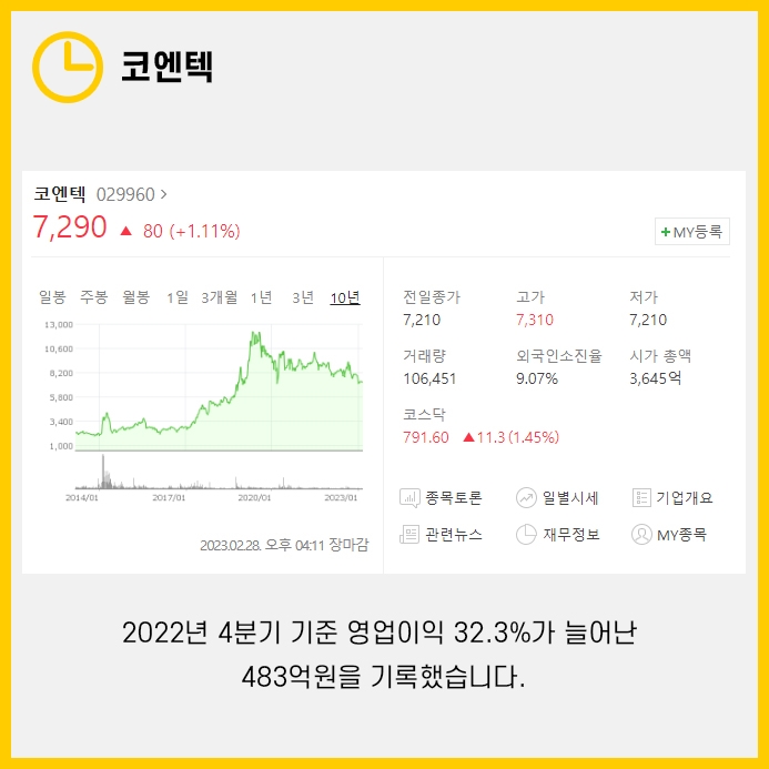 2022년 4분기 기준 코엔텍은 영업이익이 32.3%가 증가한 483억원을 달성했습니다.