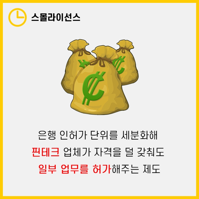 스몰라이선스는 은행 인허가 단위를 세분화해 핀테크 업체가 자격을 덜 갖추더라도 일부 은행업무를 할 수 있도록 허가해주는 제도입니다.