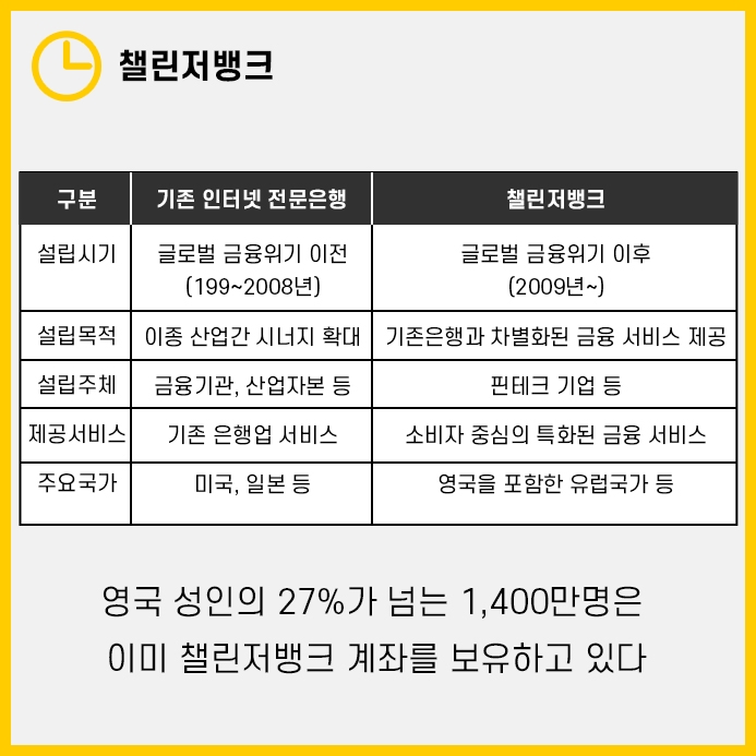디지털 기술을 활용하기에 인터넷 전문은행과도 자주 비교가 되는데, 챌린저뱅크는 소상공인 전문은행, 중소기업 전문은행 등 특정 분야의 틈새시장을 공략한다는 점에서 차이점이 있습니다.