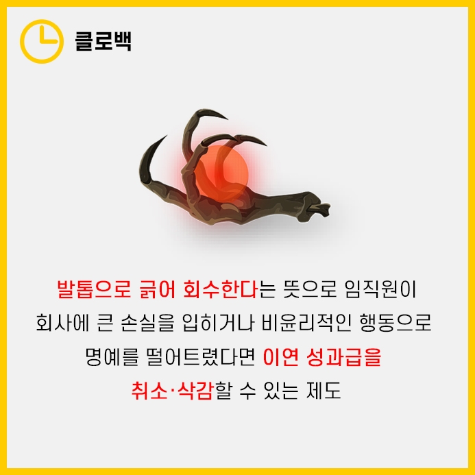 이는 발톱을 긁어 회수한다는 뜻으로 임직원이 회사에 큰 손실을 입히거나 비윤리적인 행동을 했을 시 이연 성과급을 취소할 수 있다는 내용입니다.