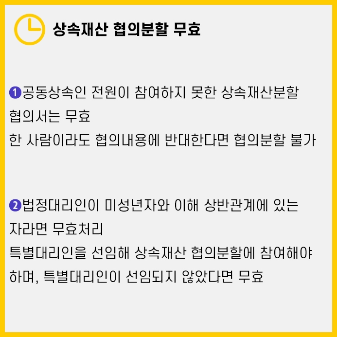 둘째, 미성년자 상속인의 법정대리인이 미성년자와 이해상반관계라면 효력이 없습니다.
