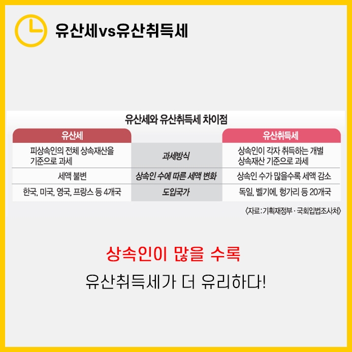 유산세때는 상속액 전체에 대해 세금을 부과했지만, 상속세 유산취득세는 1인당 상속금액을 기준으로 하기에 납부할 세액이 훨씬 줄어들기 때문입니다.