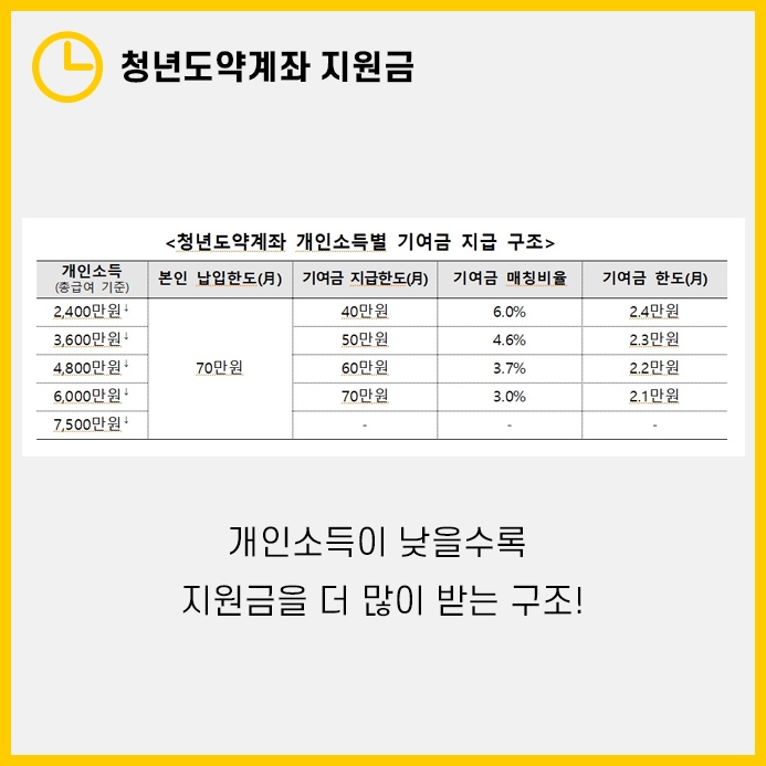 하지만 개인소득 4,800만원 초과 ~ 6,000만원 이하는 월 70만원의 본인 납입금을 넣어야 3%의 매칭비율로 월 2.1만원의 정부지원금이 들어옵니다.