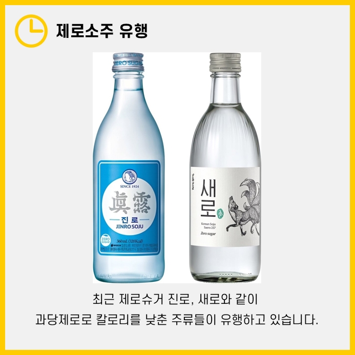 제로소주란 과당제로로 칼로리를 낮춘 소주로 하이트 진로의 제로슈거 진로, 롯데칠성의 새로가 있습니다.