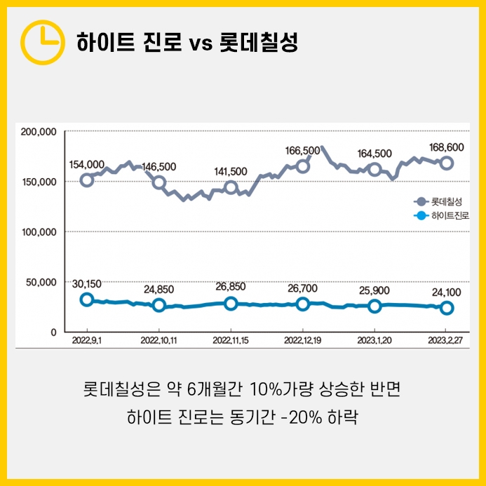 롯데칠성은 약 6개월간 10%가량 상승한 반면, 하이트 진로는 동기간 -20%나 하락했습니다.