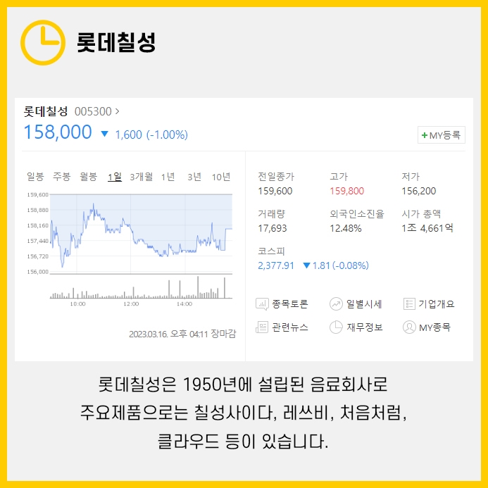 롯데칠성은 1950년에 설립되어 음료와 주류를 주로 판매하고 있습니다.