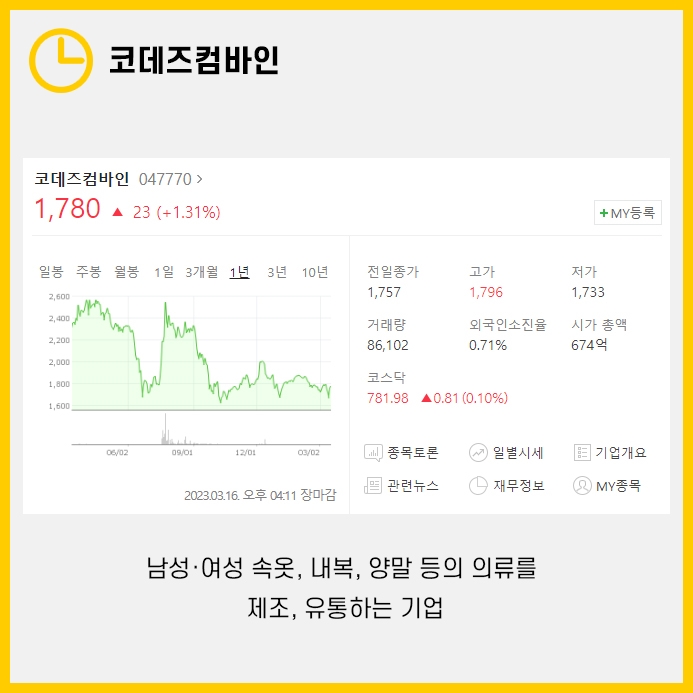 마지막으로 볼 스포츠웨어 관련주는 코데즈컴바인입니다.